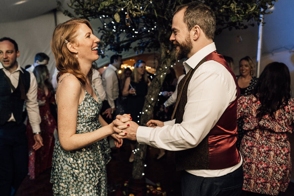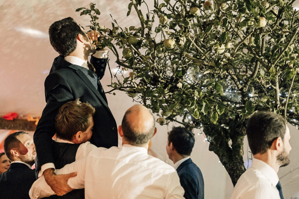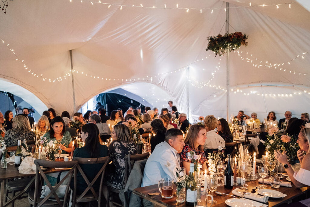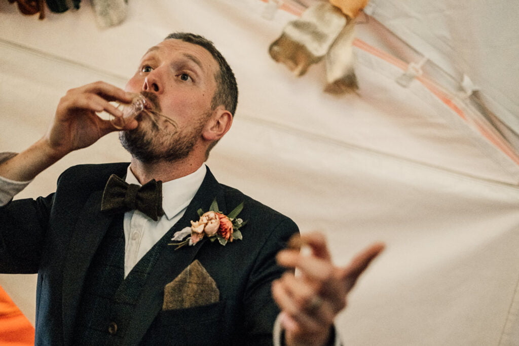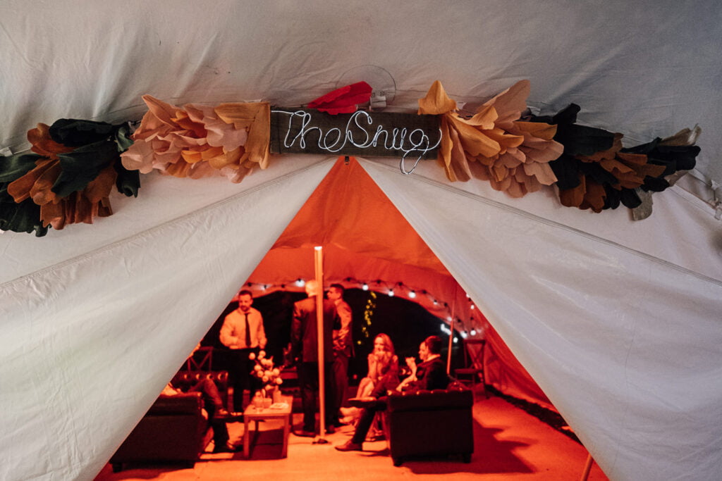 Gillian & Alasdair had been dreaming of a marquee wedding on the land of Gillians sisters house since it was first mentioned, but when planning started it was soon discovered that it would be trickier than imagined. The plot wasn’t square and had an old apple tree in the middle. Obviously they didn’t want to cut a tree down! When they spoke with Nick from Nicks Pop Up Parties, he said he could absolutely arrange a marquee that would work in the space, and the tree? Well that ended up in the middle of the dance floor complete with hanging brandy apple shots, genius! The couple completed the look with a snug, homemade alcohol, garden games and a stunning seating area for the meal. Check out a list of all the suppliers below.