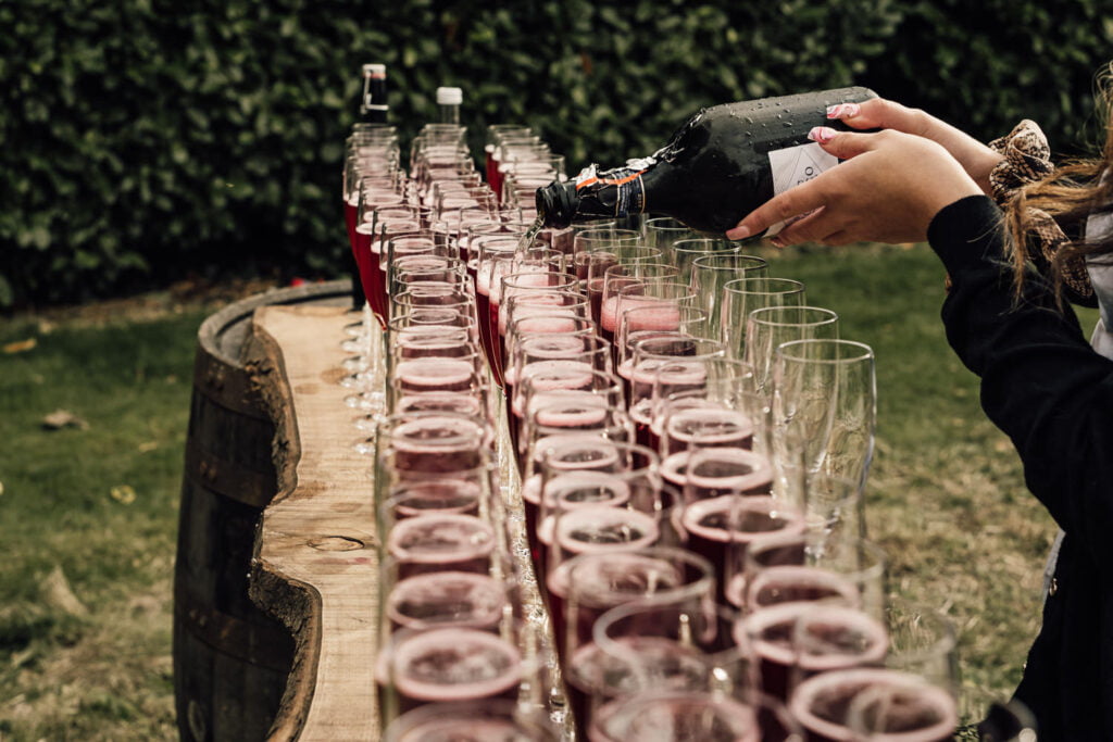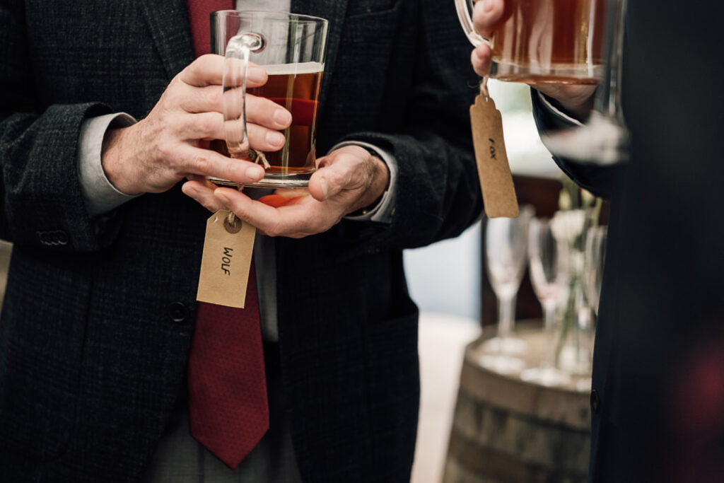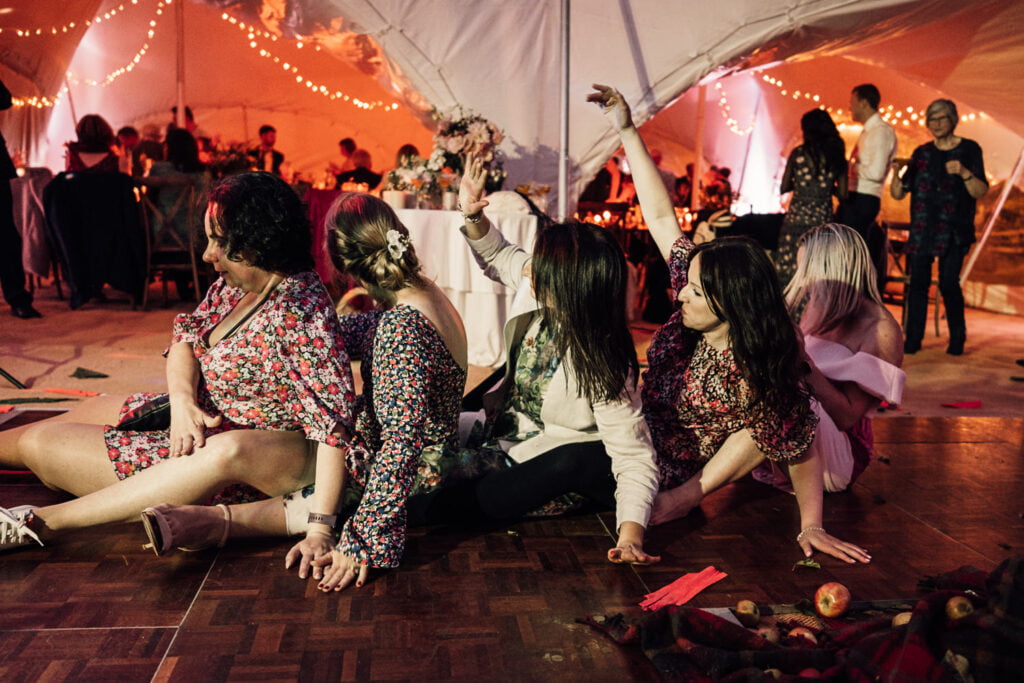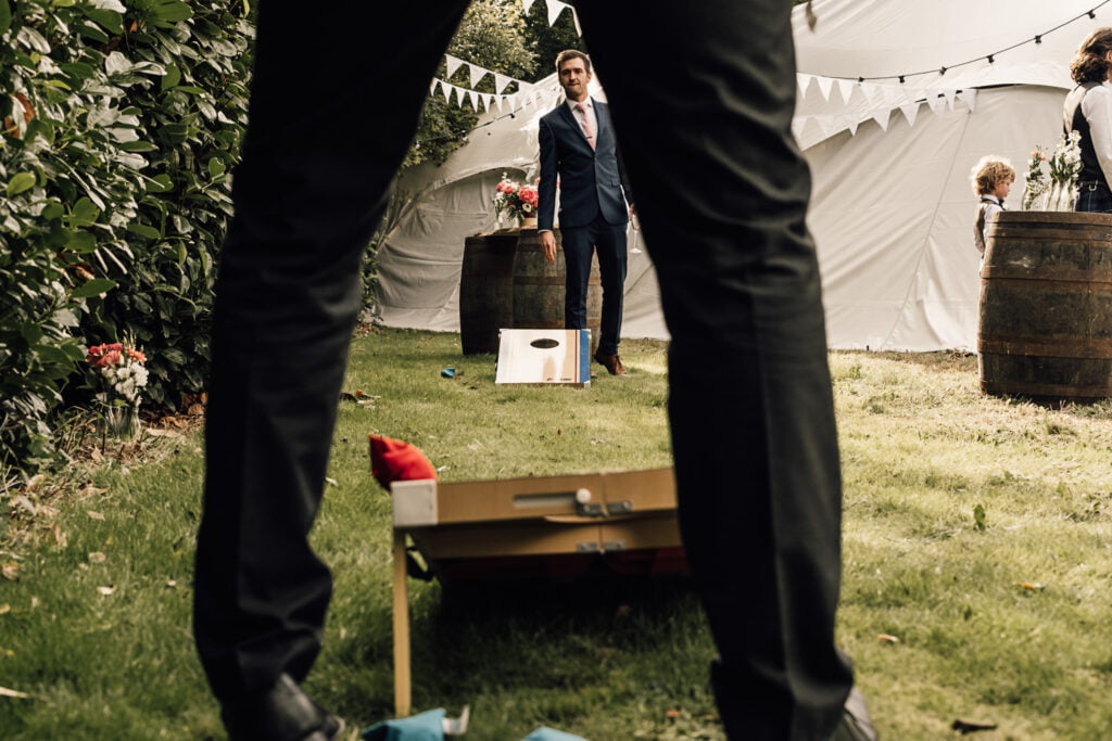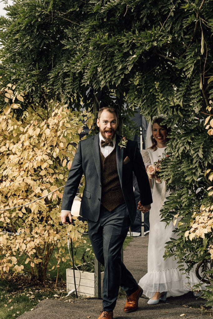Gillian & Alasdair had been dreaming of a marquee wedding on the land of Gillians sisters house since it was first mentioned, but when planning started it was soon discovered that it would be trickier than imagined. The plot wasn’t square and had an old apple tree in the middle. Obviously they didn’t want to cut a tree down! When they spoke with Nick from Nicks Pop Up Parties, he said he could absolutely arrange a marquee that would work in the space, and the tree? Well that ended up in the middle of the dance floor complete with hanging brandy apple shots, genius! The couple completed the look with a snug, homemade alcohol, garden games and a stunning seating area for the meal. Check out a list of all the suppliers below.